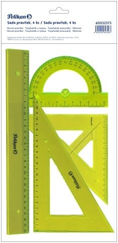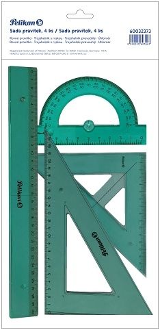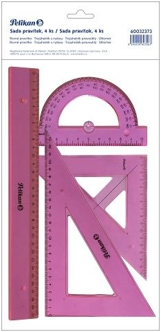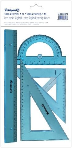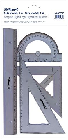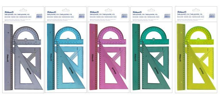 Balení obsahuje: trojúhelník s ryskou, rovné pravítko o délce 30 cm, pravoúhlý trojúhelník, úhloměr, mix barev