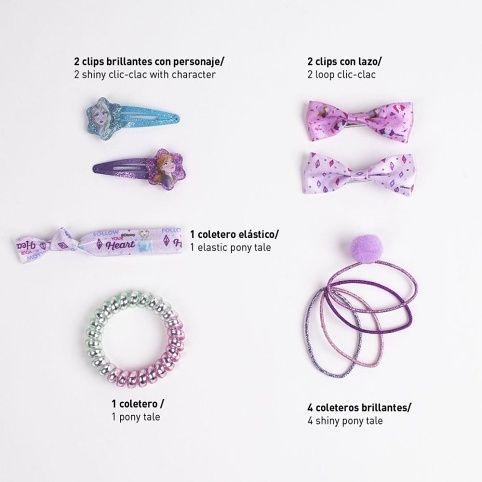 Set doplňků do vlasů v krabičce v licenci Frozen 2. Balení obsahuje 2 sponky, 2 klipy do vlasů, 3 druhy gumiček (celkem 6ks). Vhodné od 3 let.