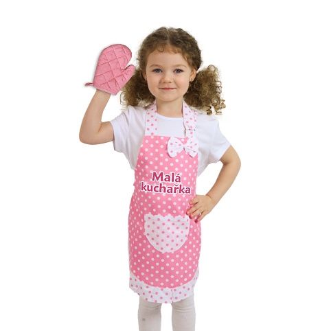 Roztomilá dětská kuchařská zástěra v růžovém provedení s bílými puntíky. Tuto vychytávku ocení každá malá hospodyňka při pomoci v kuchyni. Obsahuje také rukavici.
