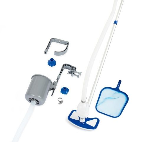 Set obsahuje: povrchový skimmer na listy, který výrazně usnadňuje čištění bazénu. Bazénový vysavač na stěny a podlahu bazénu. Skimmer na manuální odstranění plovoucích nečistot. Nastavitelná násada (279 cm)