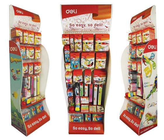 Produktový kovový stojan na školní potřeby značky DELI. Marketingové upoutávky po stranách stojanu a potištěná měkčená deska nahoře jsou odnímatelné. Velikost: 200cm x 60cm x 40cmPočet háčků: 40 (bez cedulek na cenu)Počet polic: 2 (mohou být odstraněny dle potřeby)Materiál: kov