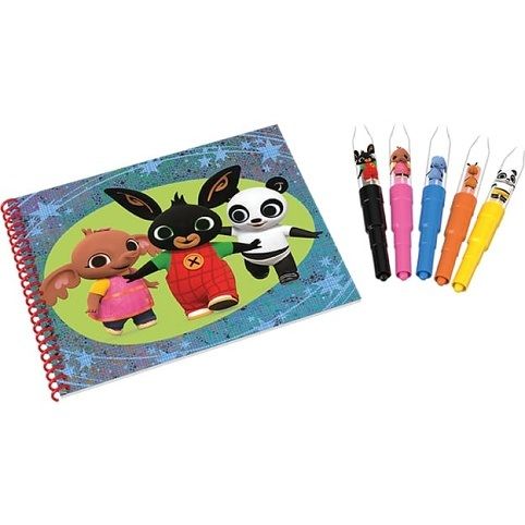 Set obsahuje 5 barevných foukacích fixů s potiskem, sešit s obrázky k vybarvení a plastovou šablonku.