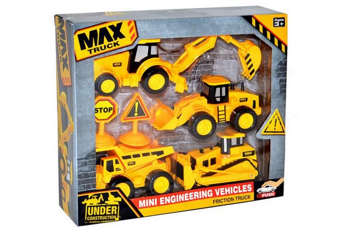 Set plastových stavebních strojů. Balní obsahuje čtyři stavební stroje a dvě dopravní značky.