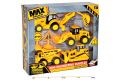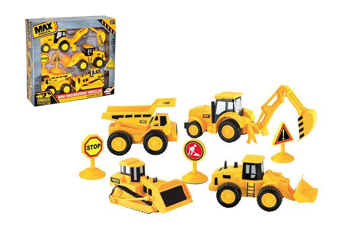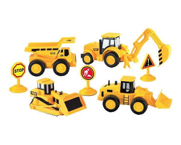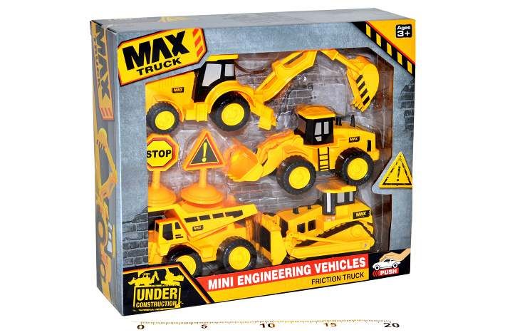 Sada stavebních strojů na setrvačník. Velikost strojů 10 až 21 cm. Set obsahuje 4 stavební stroje - buldozery a bagry, sklápeč a značky.