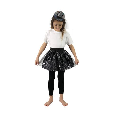 Bezva sada pro všechny malé parádnice čarodějnice! Sukýnka má černou spodničku, překrytou tylem s potiskem stříbrných hvězdiček. Je určena pro holčičky ve věkovém rozmezí 3-7 let. Délka sukně je 28 cm. Set je doplněn o čelenku s kloboučkem, který perfektně ladí k sukýnce. Skvěle se hodí i na oslavu Halloweenu nebo karneval!
