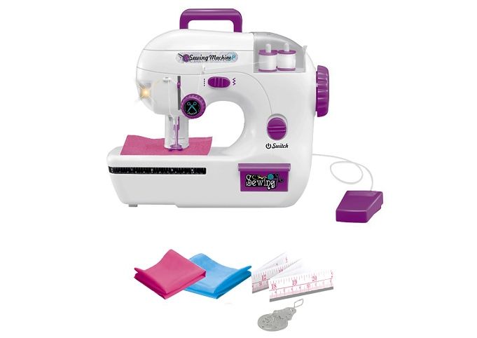 Šicí stroj. Velikost 24cm. Baterie 4xAA nejsou součástí. Obsahuje kousky látky, navlékač jehel, metr. USB kabel součástí.