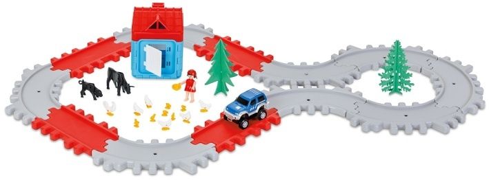 Silnice-autodráha se zvířátky a domečkem. Součástí balení autíčko na baterii. Rozměry sestavené autodráhy jsou 98 cm dlouhá a 61 cm široká.