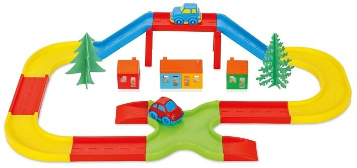 Silnice-autodráha s mostem na pylířích vysokým 14 cm, s 3 budovami, zelené stromy. Součástí balení jsou 2 autíčka. Rozměry sestavené autodráhy jsou 69×43×14 cm.