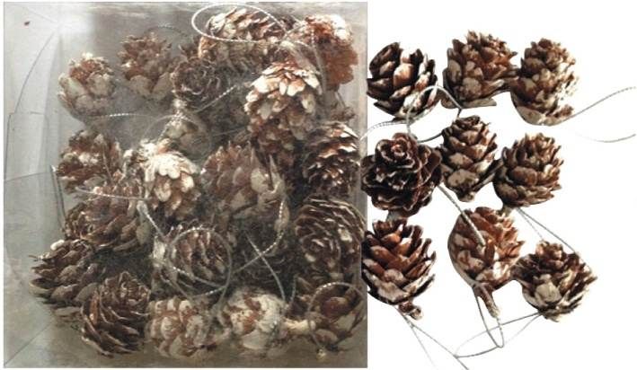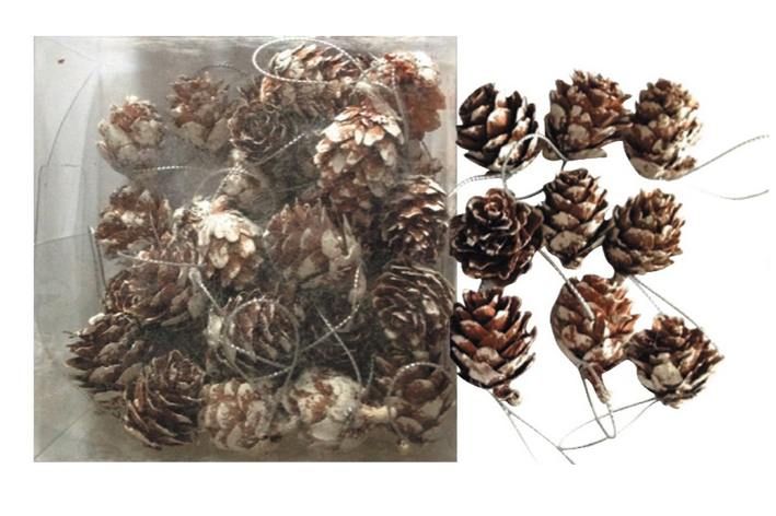 Sada 60 ks přírodních šišek s bílým dekorem a stříbrným poutkem k zavěšení na vánoční stromek nebo jinou vánoční dekoraci.