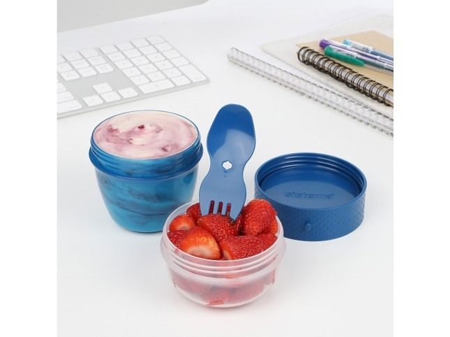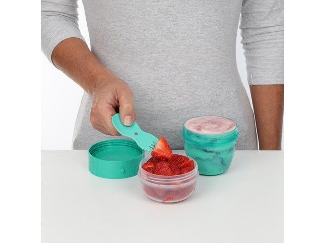 Dóza je rozdělena do dvou přihrádek, takže si s sebou můžete vzít různé druhy svačiny bez rizika, že se smíchají. Do větší přihrádky si můžete dát například salát, ovesnou kaši nebo sendvič, do menší pak ovoce, ořechy, jogurt nebo müsli. Dóza je vybavena integrovanou vidličkou, takže nemusíte nosit s sebou žádné další příbory. Vidlička je pevně uchycena k víčku a po použití ji jednoduše zasunete zpět. Výhody: Snadné uzamykání: Klip Sistema® a pružné těsnění Integrovaná vidlička