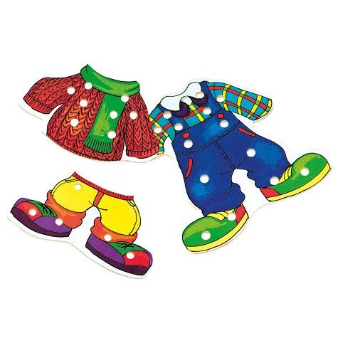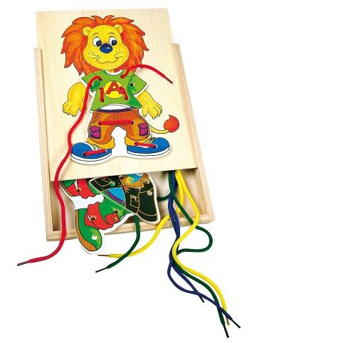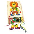 Moje první šití! Lviček Leo má v dřevěné krabičce spoustu oblečení. Přišívání oblečení tkaničkou podporuje dětskou motoriku.