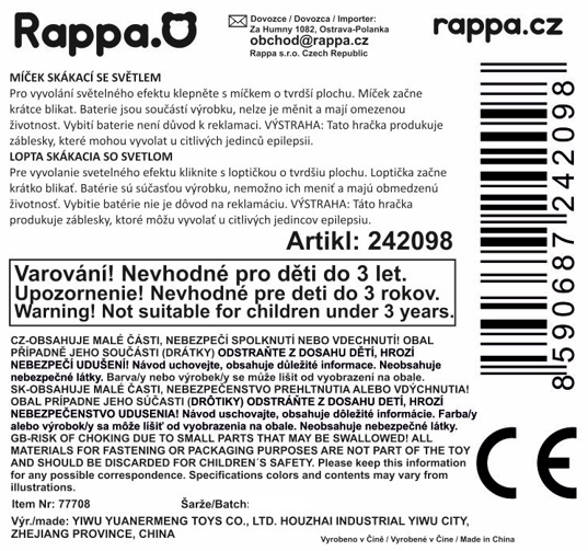 Barevný míček se světelným efektem! Po hození míčku o tvrdou plochu začne barevně blikat. Použití blikacího míčku může být také účinným způsobem, jak stimulovat vizuální vnímání a koordinaci, zejména u dětí. Prodává se pouze po celém balení 12 ks.