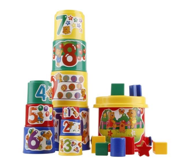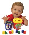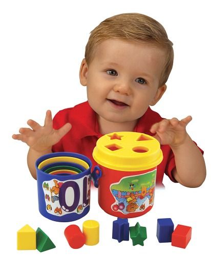 dítě učí rozpoznávat tvary. Děti také mohou barevné kelímky skládat na