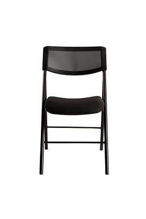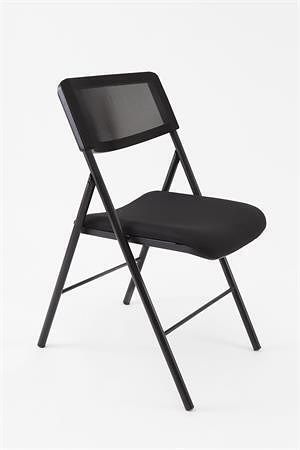 Skládací židle s vyztuženým pěnovým sedákem a síťovou zádovou opěrkou s ergonomickým tvarováním zajišťuje pohodlí a dostatečný komfort.
