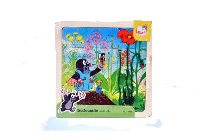 Dřevěné rámkové dětské puzzle (skládačka) s Krtečkem. Bino Skládanka Krtek a kalhotky obsahuje 20 dílků s motivy oblíbeného večerníčku. Dílky se mohou umisťovat na dřevěnou desku s rámečkem nebo lze obrázek skládat bez rámečku. Dřevěné puzzle Bino Krtek a kalhotky se jistě budou líbit všem dětem. Rozvíjí jemnou motoriku dětí a paměťové schopnosti.