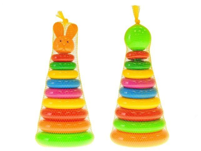 Skládačka pyramida s kroužky plast 28cm -v síťce - od 12 měsíců.