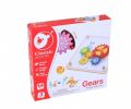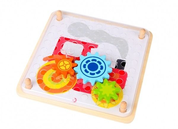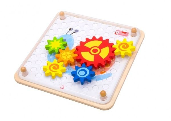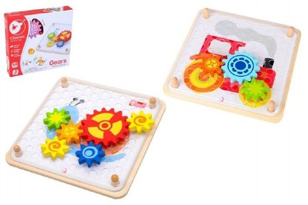 Dřevěná skládačka ozubená kolečka s předlohami. Jedná se o dřevěnou tabulku, do které se vkládají jednotlivé předlohy, které jsou součástí balení - celkem 14 různých předloh.(zvířátek, domečků, aut apod). Na předloze je nakresleno které ozubené kolečko má dítě dát na které místo. Po složení může jednotlivá kolečka roztočit