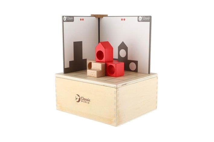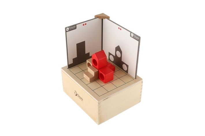 Tato sada bloků procvičí prostorovou orientaci dětí a schopnost logického myšlení. Sada využívá inspiraci ze světelné projekce. Děti pomocí svého prostorového myšlení sestaví blok podle kartičky a musí sladi obě strany. Karty jsou od jednoduchých až po obtížné úrovně. Balení obsahuje 41 dřevěných dílků a 14 karet.