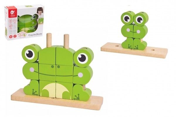 Skládanka žába obsahuje 17 dřevěných dílků (12 kostek, podložka, 4 tyčky), které lze různě stavět na podložku s tyčkami. Děti si tak mohou postavit různé předměty i zvířata. V sadě najdete 5 oboustraných předloh pro skládání.