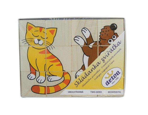 Oblíbené puzzle pro nejmenší. Sada obsahuje 12 dřevěných kamenů 40x40x6mm potištěných z obou stran. Celkem lze složit 5 různých zvířátek (ne najednou). Dítě nejen skládá, ale musí nejprve rozlišit, k jakému zvířátku kámen patří. 3 obrázky jsou ze 4 kamenů, 2 obrázky ze 6 kamenů.
