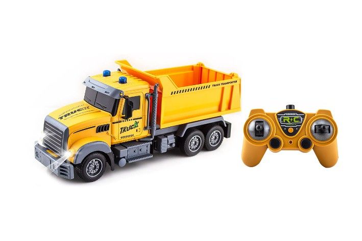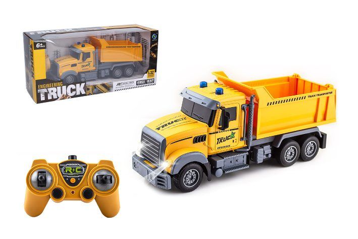 Sklápěč RC na dálkové ovládání. Rozměry 29x9x12,5 cm. Frekvence 2. 4GHz. Světelné a zvukové efekty. 3. 7V bateriový pack do sklápěče součástí, 2xAA baterie do ovladače nejsou součástí. USB kabel součástí.
