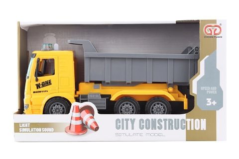 Plastové nákladní auto - sklápěčka na baterie. Pomocí dvou tlačítek umístěných na kabině vydává zvuky jízdy a couvání. Po zmáčnutí auto vyklopí náklad.Baterie 3xAG13 jsou součástí balení. Pomocí manuálního tlačítka lze vyklopit korbu. Baleno v krabici. Rozměry balení cca 32x11,5x18x5 cm. Rozměry auta cca 27x11x10 cm. Věk 3+