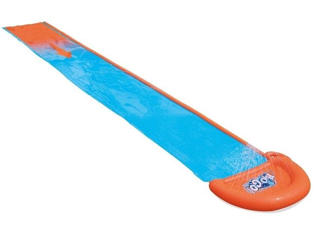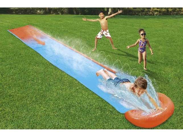 Zahradní skluzavka s jednou dráhou. Jedná se o velmi kvalitní vodní skluzavku. Díky připojovacímu ventilu můžete připojit zahradní hadici a poté klouzat na vodní skluzavce. Délka skluzné plochy 488 cm zaručuje opravdu dlouhý skluz a zábavu na celé odpoledne. Stačí vodní skluzavku roztáhnout na vaši zahradě a zábava může začít. Parametry:Skluzná plocha 488 cmMožnost připojení hadice k namáčení kluzné plochyVelmi kvalitní použité materiályVodotrysk na konci skluzavkyOd 5 do 12 let