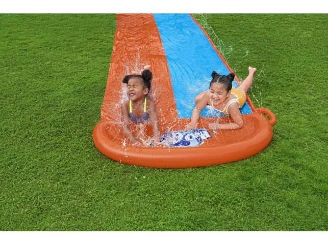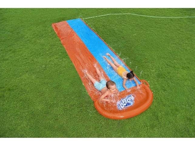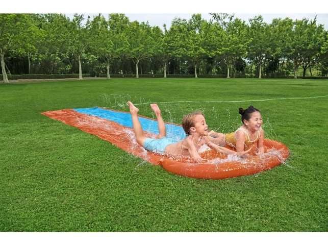 Užijte si skvělou letní zábavu na vaší zahradě s dvojitou vodní skluzavkou od Bestway. Revoluční skluzavka pro malé neposedy! Stačí připojit zahradní hadici a o zábavu je postaráno. Na boční straně skluzavky stříká voda z trysek a jízdu bezpečně ukončí bazének s vodou, která při dojezdu vytvoří gejzír. Délka skluzavky 488 cm. Balení obsahuje: 1 skluzavku, 1 opravnou sadu. Vhodné pro děti od 3 let,.