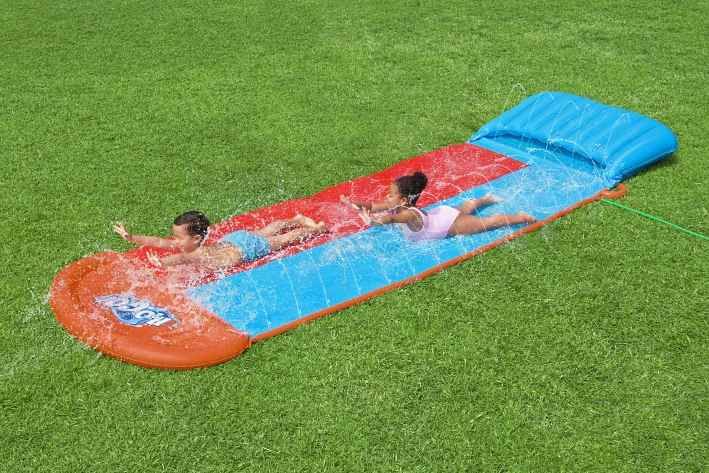 Připojte se pomocí adaptéru k zahradní hadici a jízda začíná. Téměř pětimetrová skluzavka je ideální pro závodění s kamarády.