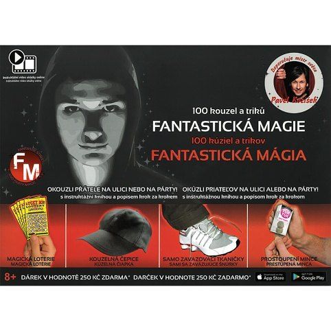 - Vhodné pro děti od 8 let. - Rozměr balení: 39×28×7,5cm. - Obsah balení: kouzelná čepice s tajuplným příslušenstvím, kouzelnický naviják, létající kreditky, magické losy, prostoupení mince, bláznivé krabičky, kouzelné tkaničky, neviditelná niť, speciální karty, kouzelný palec, samoskládající bankovka, hypnotizující mincovní terč. Speciální kouzelnickou čepici můžeš nosit každý den jako běžnou čepici a také ji použít k předvádění neuvěřitelných kouzel! Přikaž svým tkaničkám, aby se zavázaly a jako mávnutím kouzelného proutku se objeví ve tvých prázdných rukou. Proměň čisté kusy papíru na peníze a nechej krabičky od zápalek, aby se samy zavřely a otevřely. Předveď působivé karetní triky a pokus se levitovat!
