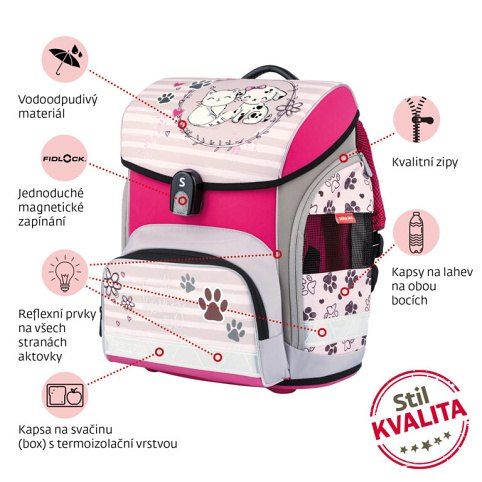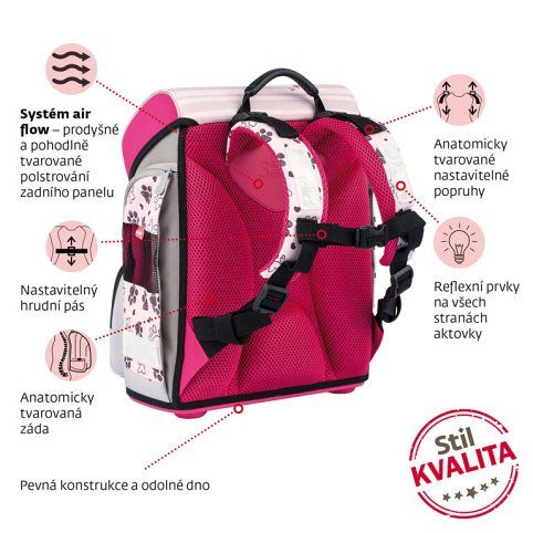 Školní aktovka pro prvňáčka (VHODNÁ PRO 1. 3. TŘÍDU). Kvalitní, ergonomicky tvarovaná odlehčená školní aktovka je vybavena reflexními prvky a anatomicky tvarovanými zády s pevnou konstrukcí. Školní aktovky Stil jsou ověřeny odborníky. PARAMETRY školní aktovky: Rozměr: výška 38 cm, šířka 32 cm, hloubka 22 cm. Hmotnost: 1 kg. Nosnost: 7 kg. Objem: 17 l. VLASTNOSTI školní aktovky. 3D ZÁDOVÝ SYSTÉM. Aktovka perfektně sedí na zádech. Anatomický zádový panel se přizpůsobí páteři dítěte a systém Air Flow a prodyšné polstrování umožní cirkulaci vzduchu a příjemné nošení. Hrudní pás s kvalitní přezkou zajistí dobré usazení aktovky na zádech dítěte. FIDLOCK: moderní patentové zapínání s magnetem pro snadné otevírání a zavírání aktovky jednou rukou. Velmi praktické a jednoduché řešení pro školáky - při přiložení víka se samo zapne. BEZPEČNOST: bezpečnostní prvky jsou velmi důležité, proto je aktovka vybavena reflexní pásky na všech stranách batohu, které zaručí lepší viditelnost a bezpečnost dítěte ve tmě. VNITŘNÍ USPOŘÁDÁNÍ: Hlavní vnitřní komora je rozdělená látkovou přepážkou pro lepší uložení pomůcek. V přední části komory je kapsička pro uložení drobností. Přední kapsa aktovky je určena pro svačinový box nebo penál.