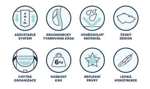 • Ergonomicky tvarovaná záda, plně nastavitelné ramenní, prsní a boční kompresní popruhy pro optimální přizpůsobení postavě