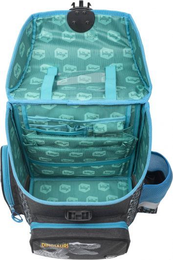 Školní aktovka s motivem dinosaurů na přední části, vhodná pro žáky 1. - 2. třídy ZŠ.