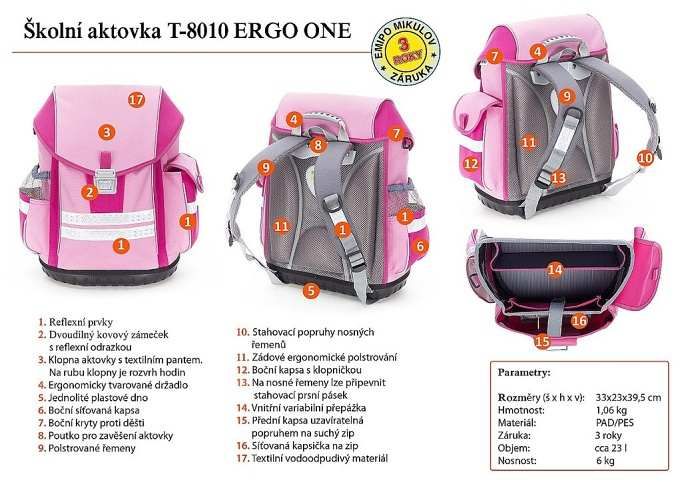 Školní aktovka ERGO ONE je konstrukčně nového typu vycházející z dlouhodobých zkušeností firmy EMIPO s jejich výrobou. Je určena pro začínající školáky a je vyráběna v souladu s ČSN 796506. Vyznačuje se pevnou konstrukcí, použitím odlehčených materiálů, bohatým vnitřním členěním, max. použitím bezpečnostních prvků, novým ergonomickým polstrováním zádové části a nosných řemenů, moderním designem, prodlouženou zárukou na 36 měsíců a nese značku Český výrobek. Vnitřní část školní aktovky je členěna variabilní všitou přepážkou na tři části. Tím je zajištěna větší efektivita pro vnitřní uspořádání jednotlivých školních pomůcek (sešitů, knih apod.) podle individuální potřeby žáka. Na předním dílu je našita dále velká kapsa rozměrů š. 21,5 x h. 5 x v. 27 cm. Její horní část kapsy se uzavírá pomocí popruhu se suchým zipem. Uvnitř kapsy je našita síťovaná kapsička na zip. Přes celou šířku přední kapsy jsou našity dva bezpečnostní reflexní pásky, dále pak potom i přes obě boční kapsy jeden a stejně tak na nosných řemenech. Aktovka je uzavřena prostorově tvarovanou klopnou přes celý svůj obvod, včetně přední kapsy. Tím je chráněn obsah aktovky před znehodnocením při deštivém počasí. Na vnitřní straně klopny je rozvrh hodin. Použité vnější textilní materiály (převážně PES) jsou opatřeny na povrchu vodoodpudivou impregnací. Klopna je zajištěna proti otevření kovovým aktovkovým zámkem s reflexní odrazkou. Zámek díky svému uchycení, lze jednoduše otevřít jednou rukou. Zadní část aktovky tvoří nově vyvinuté ergonomické polstrování ze speciální síťoviny s vetkanou PU pěnou, která zajišťuje optimální cirkulaci vzduchu v zádové části. Oba tyto faktory přispívají nejen k pohodlnému nošení aktovky, ale také zajišťují správné zatížení a vývoj páteřního systému. V horní části zádové části se ještě nachází textilní poutko pro zavěšení aktovky na lavici a ergonomické držadlo. Dolní část batohu je opatřena jednolitým plastovým dnem, které umožňuje dlouhodobé stání aktovky na mokré podložce, aniž by hrozilo znehodnocení jejího obsahu. Korpus aktovky je na každém boku osazen prostornou boční kapsou. Se síťovinou je určena na lahev s pitím a s klopničkou na penál nebo svačinu. Při celkových rozměrech š. 37 (včetně kapes) x h. 23 x v. 39,5 cm váží batoh jen pouhých 1,06 kg! Společnost EMIPO Vám nabízí extra lehkou kvalitní školní aktovku s pevnou konstrukcí, tříletou zárukou a doživotně bezplatným servisem!