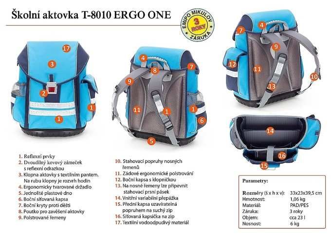 Školní aktovka ERGO ONE je konstrukčně nového typu vycházející z dlouhodobých zkušeností firmy EMIPO s jejich výrobou. Je určena pro začínající školáky a je vyráběna v souladu s ČSN 796506. Vyznačuje se pevnou konstrukcí, použitím odlehčených materiálů, bohatým vnitřním členěním, max. použitím bezpečnostních prvků, novým ergonomickým polstrováním zádové části a nosných řemenů, moderním designem, prodlouženou zárukou na 36 měsíců a nese značku Český výrobek. Vnitřní část školní aktovky je členěna variabilní všitou přepážkou na tři části. Tím je zajištěna větší efektivita pro vnitřní uspořádání jednotlivých školních pomůcek (sešitů, knih apod.) podle individuální potřeby žáka. Na předním dílu je našita dále velká kapsa rozměrů š. 21,5 x h. 5 x v. 27 cm. Její horní část kapsy se uzavírá pomocí popruhu se suchým zipem. Uvnitř kapsy je našita síťovaná kapsička na zip. Přes celou šířku přední kapsy jsou našity dva bezpečnostní reflexní pásky, dále pak potom i přes obě boční kapsy jeden a stejně tak na nosných řemenech. Aktovka je uzavřena prostorově tvarovanou klopnou přes celý svůj obvod, včetně přední kapsy. Tím je chráněn obsah aktovky před znehodnocením při deštivém počasí. Na vnitřní straně klopny je rozvrh hodin. Použité vnější textilní materiály (převážně PES) jsou opatřeny na povrchu vodoodpudivou impregnací. Klopna je zajištěna proti otevření kovovým aktovkovým zámkem s reflexní odrazkou. Zámek díky svému uchycení, lze jednoduše otevřít jednou rukou. Zadní část aktovky tvoří nově vyvinuté ergonomické polstrování ze speciální síťoviny s vetkanou PU pěnou, která zajišťuje optimální cirkulaci vzduchu v zádové části. Oba tyto faktory přispívají nejen k pohodlnému nošení aktovky, ale také zajišťují správné zatížení a vývoj páteřního systému. V horní části zádové části se ještě nachází textilní poutko pro zavěšení aktovky na lavici a ergonomické držadlo. Dolní část batohu je opatřena jednolitým plastovým dnem, které umožňuje dlouhodobé stání aktovky na mokré podložce, aniž by hrozilo znehodnocení jejího obsahu. Korpus aktovky je na každém boku osazen prostornou boční kapsou. Se síťovinou je určena na lahev s pitím a s klopničkou na penál nebo svačinu. Při celkových rozměrech š. 37 (včetně kapes) x h. 23 x v. 39,5 cm váží batoh jen pouhých 1,06 kg! Společnost EMIPO Vám nabízí extra lehkou kvalitní školní aktovku s pevnou konstrukcí, tříletou zárukou a doživotně bezplatným servisem!