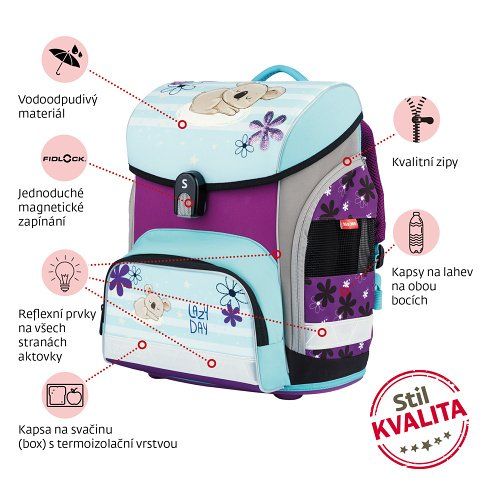 Kvalitní, ergonomická a velmi odolná školní aktovka je vybavena reflexními prvky a anatomicky tvarovanými zády s pevnou konstrukcí. FIDLOCK - moderní patentové zapínání s magnetem pro snadné otevírání a zavírání aktovky jednou rukou. Vodoodpudivý materiál,reflexní prvky,kapsa na luch box.