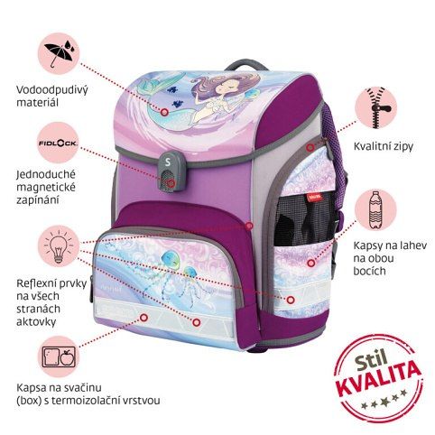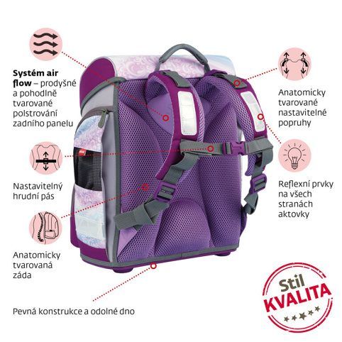 Školní aktovka pro prvňáčka (VHODNÁ PRO 1. 3. TŘÍDU). Kvalitní, ergonomicky tvarovaná odlehčená školní aktovka je vybavena reflexními prvky a anatomicky tvarovanými zády s pevnou konstrukcí. Školní aktovky Stil jsou ověřeny odborníky. PARAMETRY školní aktovky: Rozměr: výška 38 cm, šířka 32 cm, hloubka 22 cm. Hmotnost: 1 kg. Nosnost: 7 kg. Objem: 17 l. VLASTNOSTI školní aktovky. 3D ZÁDOVÝ SYSTÉM. Aktovka perfektně sedí na zádech. Anatomický zádový panel se přizpůsobí páteři dítěte a systém Air Flow a prodyšné polstrování umožní cirkulaci vzduchu a příjemné nošení. Hrudní pás s kvalitní přezkou zajistí dobré usazení aktovky na zádech dítěte. FIDLOCK: moderní patentové zapínání s magnetem pro snadné otevírání a zavírání aktovky jednou rukou. Velmi praktické a jednoduché řešení pro školáky - při přiložení víka se samo zapne. BEZPEČNOST: bezpečnostní prvky jsou velmi důležité, proto je aktovka vybavena reflexní pásky na všech stranách batohu, které zaručí lepší viditelnost a bezpečnost dítěte ve tmě. VNITŘNÍ USPOŘÁDÁNÍ: Hlavní vnitřní komora je rozdělená látkovou přepážkou pro lepší uložení pomůcek. V přední části komory je kapsička pro uložení drobností. Přední kapsa aktovky je určena pro svačinový box nebo penál.