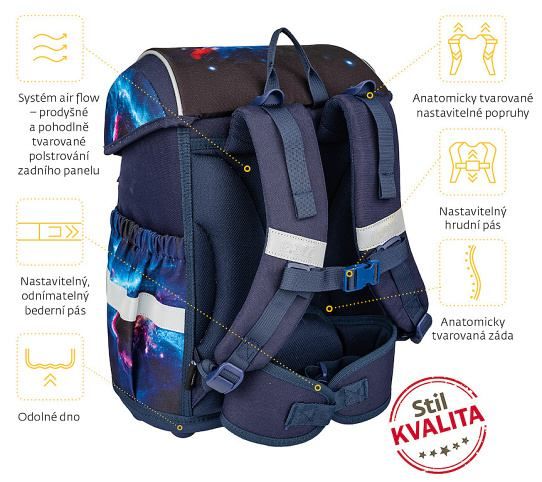 - POHODLÍ – výškově nastavitelný hrudní a nově i odnímatelný bederní pás s kvalitní přezkou zajistí pohodlné usazení aktovky na zádech dítěte i správné rozložení váhy