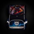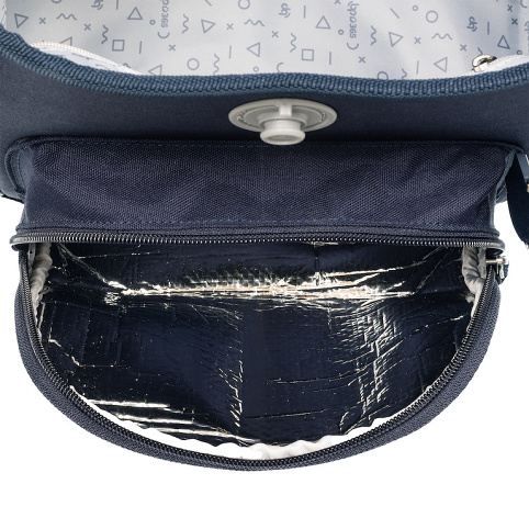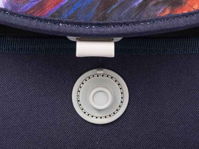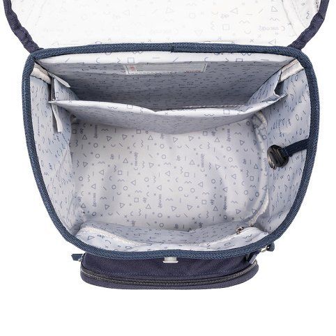 - VNITŘNÍ USPOŘÁDÁNÍ – prostorná hlavní vnitřní komora je rozdělená látkovou přepážkou pro uložení boxu na sešity či knih. Součástí hlavní komory je také kapsička pro uložení drobností, odepínatelný kroužek na klíč a štítek na jméno a adresu. Ve víku je průhledná kapsička na rozvrh hodin