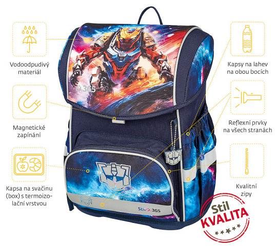 - Po obou stranách batohu se nalézají kapsy na deštník nebo lahev s pitím. Kapsy svým umístěním a elastickými okraji pomáhají eliminovat riziko rozlití nápoje a poničení obsahu aktovky. Školní aktovky jsou navrženy s ohledem na potřeby dětí i klid rodičů. Jsou praktické, hravé a doplněné o reflexní přívěsek, který zvyšuje bezpečnost při každém kroku.