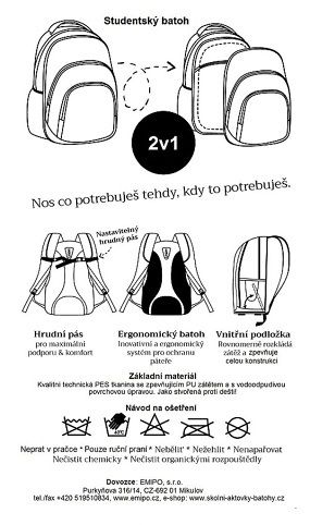 Studentský batoh 2v1 ANNA je dvoudílný a čtyřkomorový. Dvoudílný (2v1) znamená, že zip u druhé komory jde buď úplně rozepnout a tím se rozdělí batoh na dva. Vzniklý větší má zádovou část s polstrováním a ergonomickým systémem pro ochranu páteře. Široké nosné řemeny jsou opatřeny výškově nastavitelným spojovacím prsním páskem. Dno batohu má vnitřní podložku, která zpevní jeho celkovou konstrukci a zajistí stabilitu batohu při jeho postavení na zem. Na předním dílu je pak velká kapsa na zip. Vzniklý menší batoh, je dvoukomorový, v přední komoře s bohatě členěným organizérem našitým na velké vnitřní kapse. Organizér tvoří kapsička na mobil, další kapsička na zip a místo na psací potřeby. V horní části je upevněna karabinka na klíče. Na předním dílu je velká otevřená kapsa. Zádová část je polstrována v celé ploše. Nebo se rozepne jen částečně a slouží jako plnohodnotný čtyřkomorový batoh. Batoh má dvě síťované volně přístupná boční kapsy v horním okraji se všitou gumou. Reflexní prvky jsou jak na předním dílu, tak i na nosných řemenech. Na batoh je poskytována dvouletá záruční lhůta.