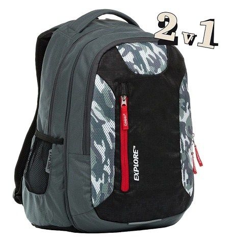 Studentský batoh 2v1 HADER je dvoudílný a čtyřkomorový. Dvoudílný (2v1) znamená, že zip u druhé komory jde buď úplně rozepnout a tím se rozdělí batoh na dva. Vzniklý větší má zádovou část s polstrováním a ergonomickým systémem pro ochranu páteře. Široké nosné řemeny jsou opatřeny výškově nastavitelným spojovacím prsním páskem. Dno batohu má vnitřní podložku, která zpevní jeho celkovou konstrukci a zajistí stabilitu batohu při jeho postavení na zem. Na předním dílu je pak velká kapsa na zip. Vzniklý menší batoh, je dvoukomorový, v přední komoře s bohatě členěným organizérem našitým na velké vnitřní kapse. Organizér tvoří kapsička na mobil, další kapsička na zip a místo na psací potřeby. V horní části je upevněna karabinka na klíče. Na předním dílu je velká kapsa se svislým zipem. Zádová část je polstrována v celé ploše. Nebo se rozepne jen částečně a slouží jako plnohodnotný čtyřkomorový batoh. Batoh má dvě síťované volně přístupná boční kapsy v horním okraji se všitou gumou. Reflexní prvky jsou jak na předním dílu, tak i na nosných řemenech. Na batoh je poskytována dvouletá záruční lhůta.