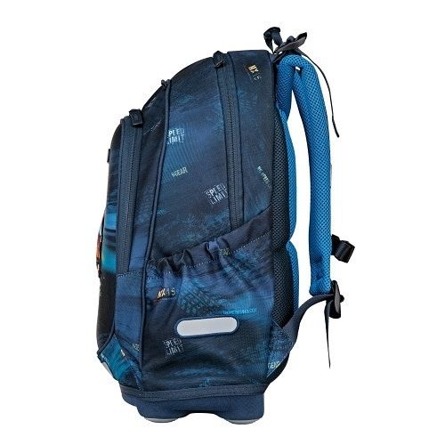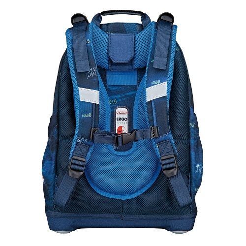 Ergonomický systém, anatomicky tvarované polstrování zad, duální nastavení ramenních popruhů, hrudní popruh, přihrádky na knihy, přední kapsa s organizérem, boční kapsy, reflexní materiál, stabilní dno s plastovými nožičkami.