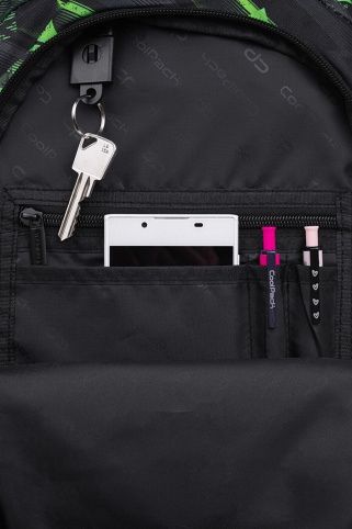 Školní pouzdro CoolPack Campus s jednou prostornou komorou. Jedna klopa s organizérem na psací potřeby a síťovaná kapsa na zip.