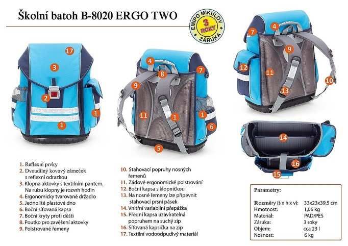 Školní batoh ERGO TWO je konstrukčně nového typu vycházející z dlouhodobých zkušeností firmy EMIPO s jejich výrobou. Je určen pro začínající školáky a je vyráběn v souladu s ČSN 796506. Vyznačuje se pevnou konstrukcí, použitím odlehčených materiálů, bohatým vnitřním členěním, max. použitím bezpečnostních prvků, novým ergonomickým polstrováním zádové části a nosných řemenů, moderním designem, prodlouženou zárukou na 36 měsíců a nese značku Český výrobek . Vnitřní část školní aktovky tvoří jedna velká komora, která je v zadní části členěna variabilní pohyblivou přepážkou. Tím je zajištěna větší variabilita pro vnitřní uspořádání jednotlivých školních pomůcek (sešitů, knih apod.) podle individuální potřeby žáka. Na přední části vnitřní strany komory je našita ještě jedna kapsa velikosti formátu B5. Na předním dílu je našita velká kapsa rozměru š. 20 x h. 5 x v. 24 cm. Její horní část kapsy se uzavírá pomocí popruhu se suchým zipem. Uvnitř kapsy je našita síťovaná kapsička na zip. Reflexní pásky jsou našity přes celou šířku přední kapsy, dále pak potom přes obě boční kapsy jeden a stejně tak jsou i na nosných řemenech. Batoh je uzavřen prostorově tvarovanou klopnou, která pevně obepíná celý obvod komory, včetně přední kapsy. Tím je chráněn obsah batohu před znehodnocením při deštivém počasí. K tomu přispívá i vodoodpudivá úprava použitých textilních materiálů (převážně PES/PAD). Na vnitřní straně klopny je rozvrh hodin se jmenovkou. Klopna je zajištěna proti otevření zámkem s reflexní odrazkou (reflektorem). Zámek jde jednoduše otevřít jednou rukou, když pod něj zasuneme dva prsty a palcem zatlačíme na reflektor s následným pohybem směrem nahoru. Zadní část aktovky tvoří nově vyvinuté ergonomické polstrování ze speciální síťoviny s vetkanou PUR pěnou, která zajišťuje optimální cirkulaci vzduchu v zádové části. Oba tyto faktory přispívají nejen k pohodlnému nošení aktovky, ale také zajišťují správné zatížení a vývoj páteřního systému. V horní části zádové části se ještě nachází textilní poutko pro zavěšení batohu na lavici a ergonomické držadlo. Jejich určení nezaměňovat! Dolní část batohu je opatřena jednolitým plastovým dnem, které umožňuje dlouhodobé stání batohu na mokré podložce, aniž by hrozilo znehodnocení jejího obsahu. Batoh je na každém boku osazen prostornou boční kapsou. Se síťovinou je určena na lahev s pitím a s klopničkou na penál nebo svačinu. Společnost EMIPO, která tuto aktovku vyrábí, Vám nabízí kvalitní, extra lehký výrobek s pevnou konstrukcí, tříletou zárukou a doživotně bezplatným servisem.