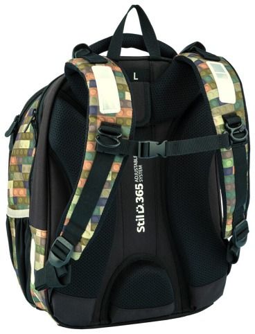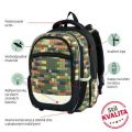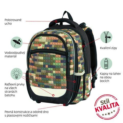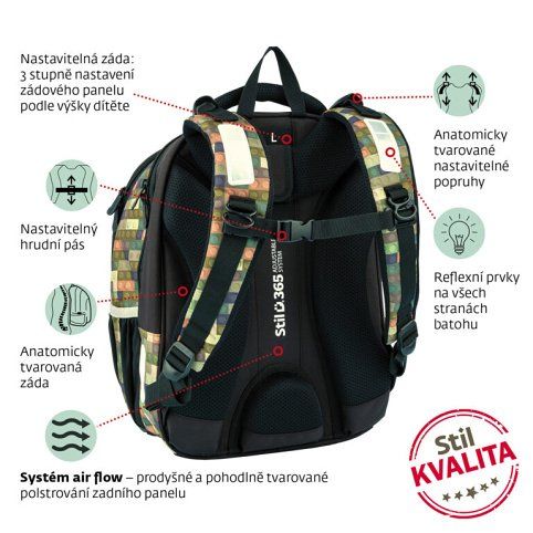 Ergonomický batoh, který roste s dítětem (Adjustable system) 3D anatomický zádový panel Systém Air Flow a prodyšné polstrování 3 prostorné komory a přední kapsy Anatomicky tvarované nastavitelné popruhy Vodoodpudivý materiál Odolné dno s plastovými nožičkami Reflexní pásky Hrudní pás Rozměry: výška 40 cm, šířka 30 cm, hloubka 20 cm Hmotnost: cca 1 kg Nosnost: 7 kg Objem: 20 l