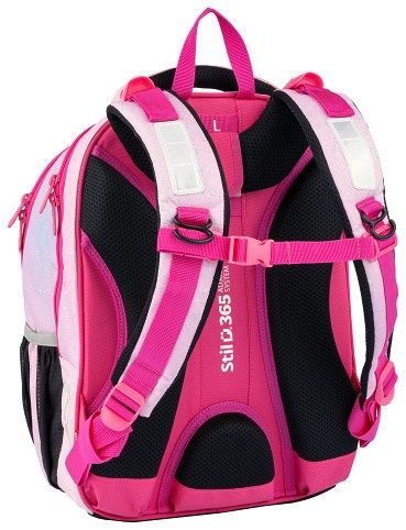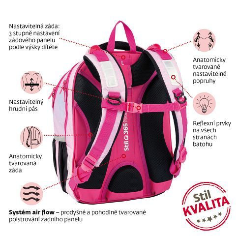 Ergonomický batoh, který roste s dítětem (Adjustable system) 3D anatomický zádový panel Systém Air Flow a prodyšné polstrování 3 prostorné komory a přední kapsy Anatomicky tvarované nastavitelné popruhy Vodoodpudivý materiál Odolné dno s plastovými nožičkami Reflexní pásky Hrudní pás Rozměry: výška 40 cm, šířka 30 cm, hloubka 20 cm Hmotnost: cca 1 kg Nosnost: 7 kg Objem: 20 l
