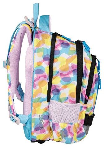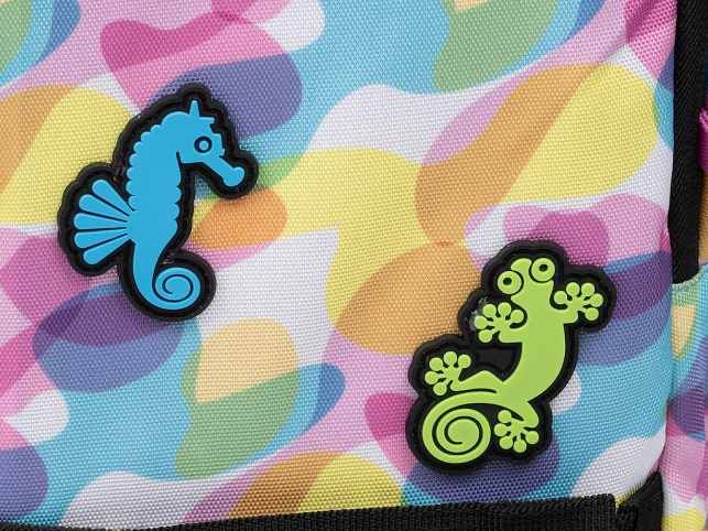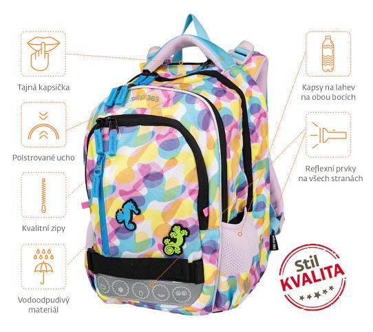 - Popruh na přední straně pro uchycení například mikiny cestou domů ze školy. Batoh Junior Vibe zaujme veselými barvami a praktickým designem. Je vybaven dvěma aplikacemi ve tvaru zvířátek, které dodávají batohu hravý a originální vzhled.