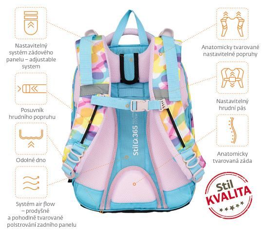 - STIL ADJUSTABLE SYSTEM – nastavitelný systém zad se třemi stupni pro optimální usazení batohu na zádech podle výšky a věku dítěte. Batoh, který roste s dítětem