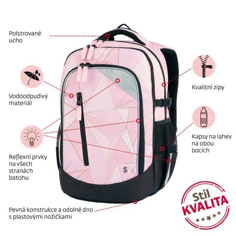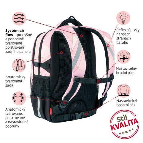 Kvalitní anatomicky tvarovaný batoh vhodný od 3. třídy, systém Air Flow a prodyšné polstrování,2komory na formát A4 a 3 vnitřní přihrádky,kapsa na notebook,vodoodpudivý materiál,zpevněné nepromokavé dno,reflexní prvky,hrudní pás.